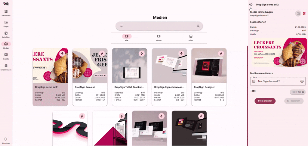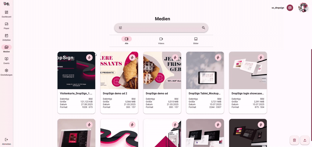 Mit DropSign verwaltest du alle Medienformate zentral und spielend leicht. Von Bildern und Videos bis hin zu interaktiven Inhalten. Die Plattform sorgt dafür, dass deine Dateien jederzeit verfügbar und auf allen Playern abspielbar sind.